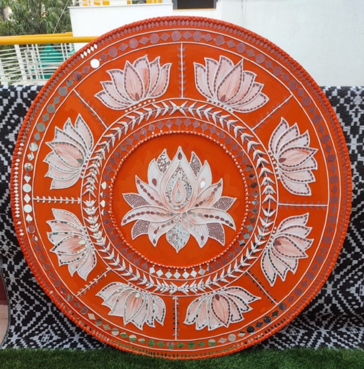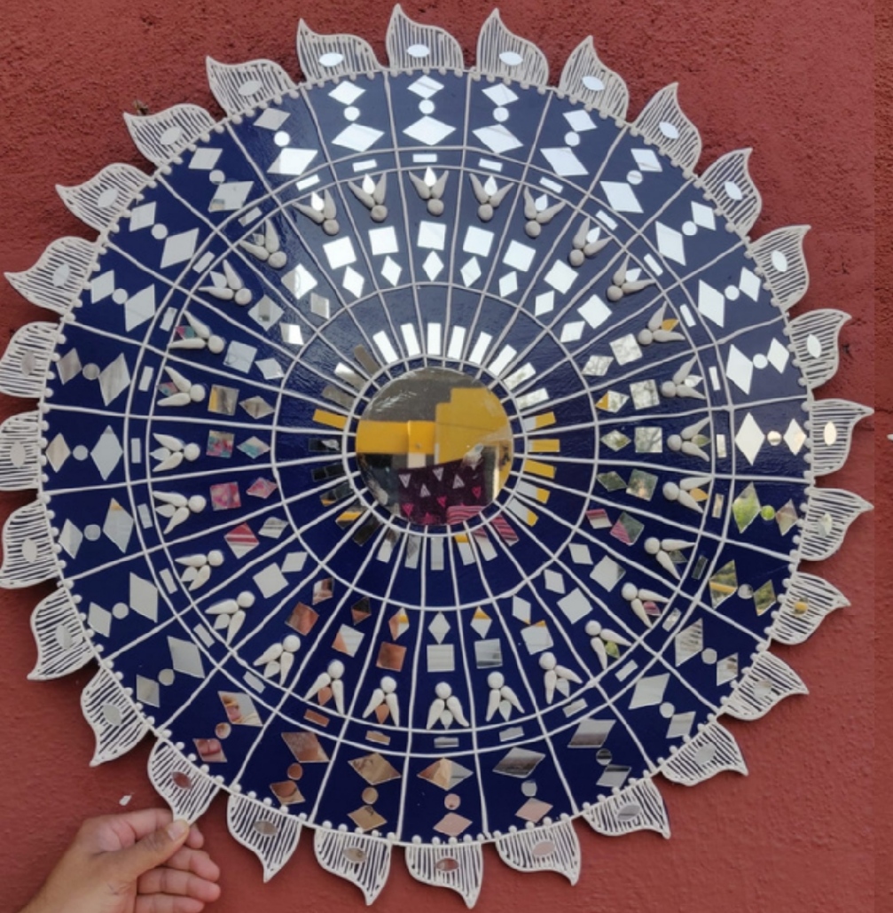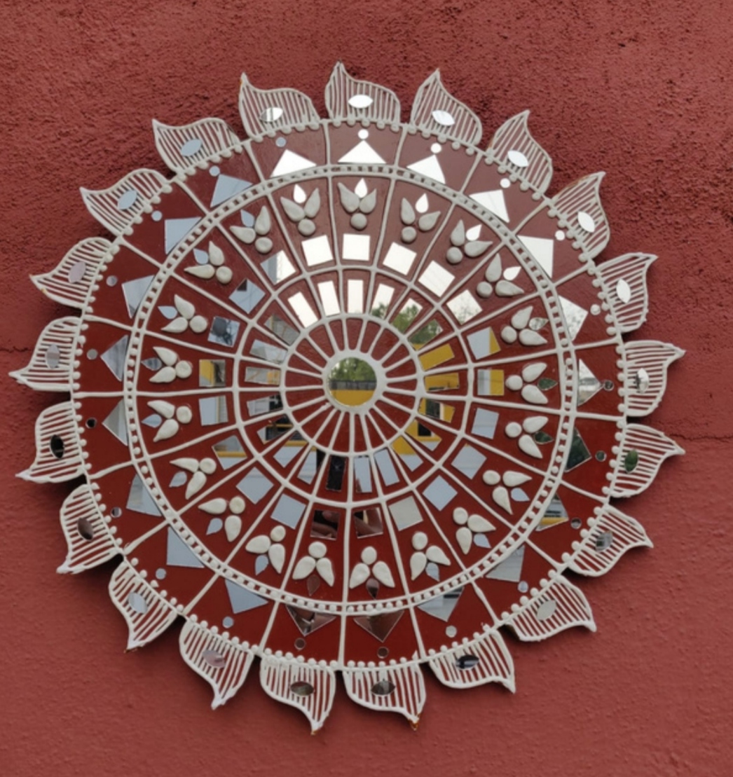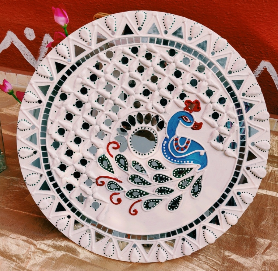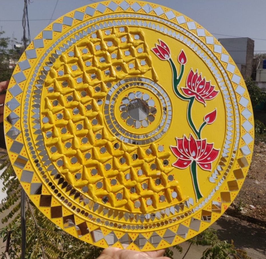It is handcrafted on desinger wooden pieces using clay, paint and mirrors etc.