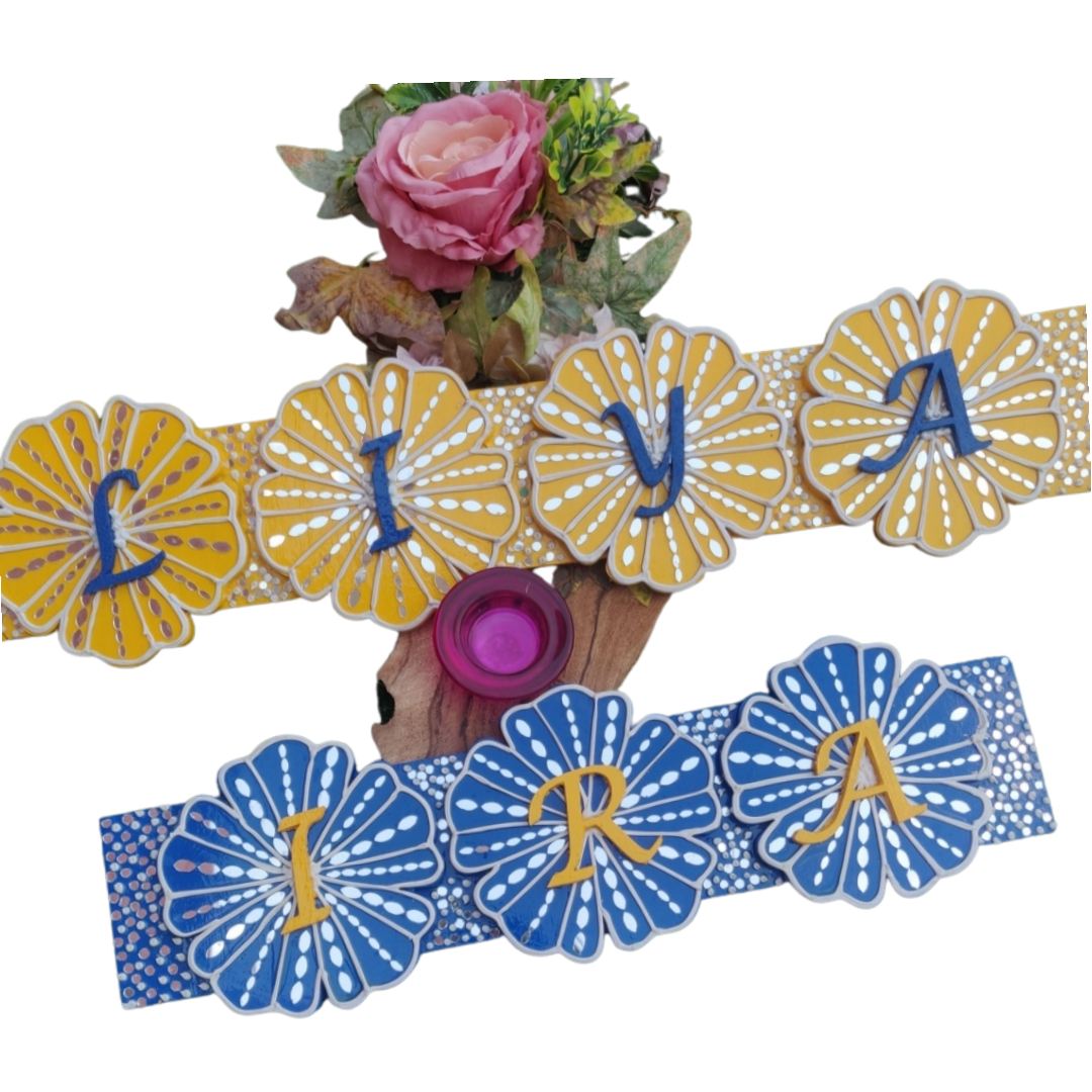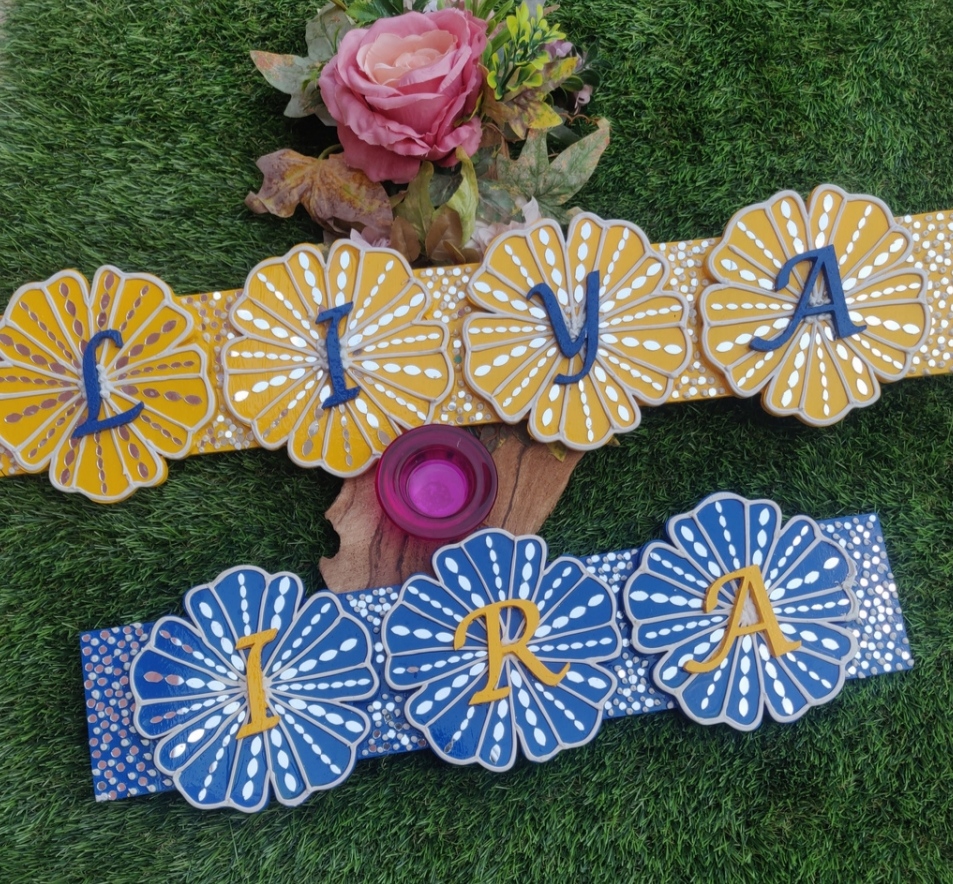 Handcrafted on designer wooden pieces using clay,paints and mirrors etc.